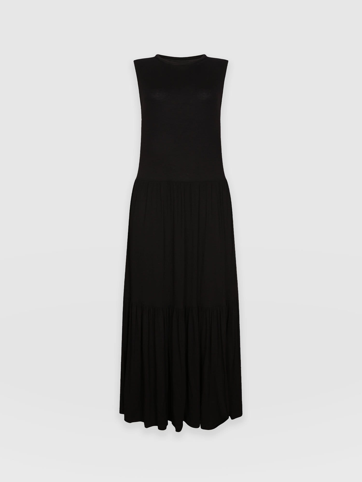 A comfortable, tiered midi dress in black made with the softest jersey for an easy look and feel for all the seasons. We designed this style with flattering tiers and used a soft and sustainable viscose fabric with a beautiful drape (and a little stretch). It has a soft and silky hand feel and a relaxed fit. Pair easily with sandals in the summer. Trainers or boots in the winter and with heels for a smarter look for work or nights out. (And yes, it has pockets)